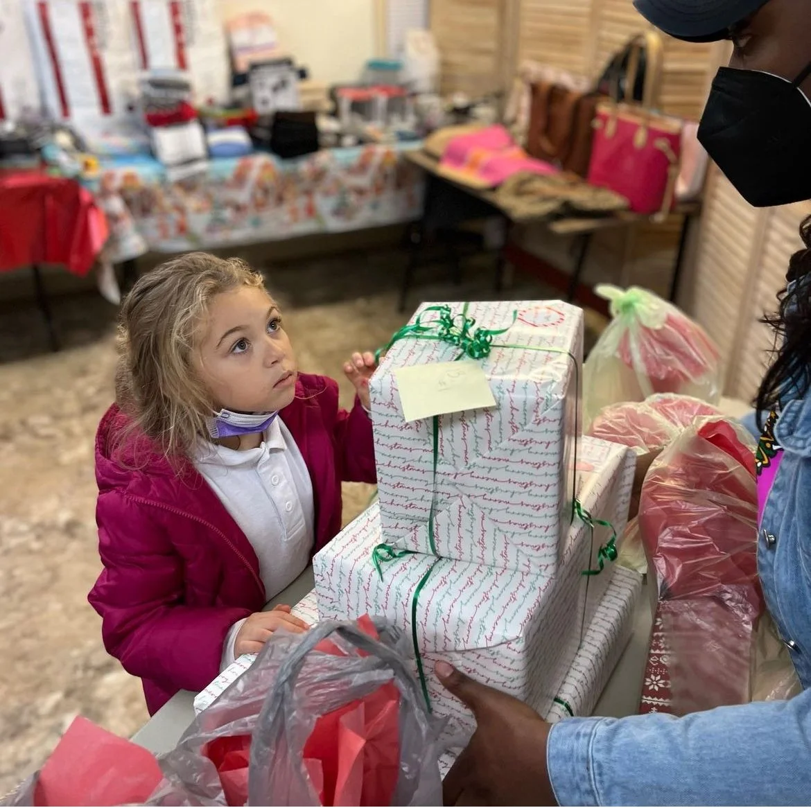 Children use "bucks" to pick up to 3 gifts: 1 for themselves, 1 for a loved one, and 1 to give away.